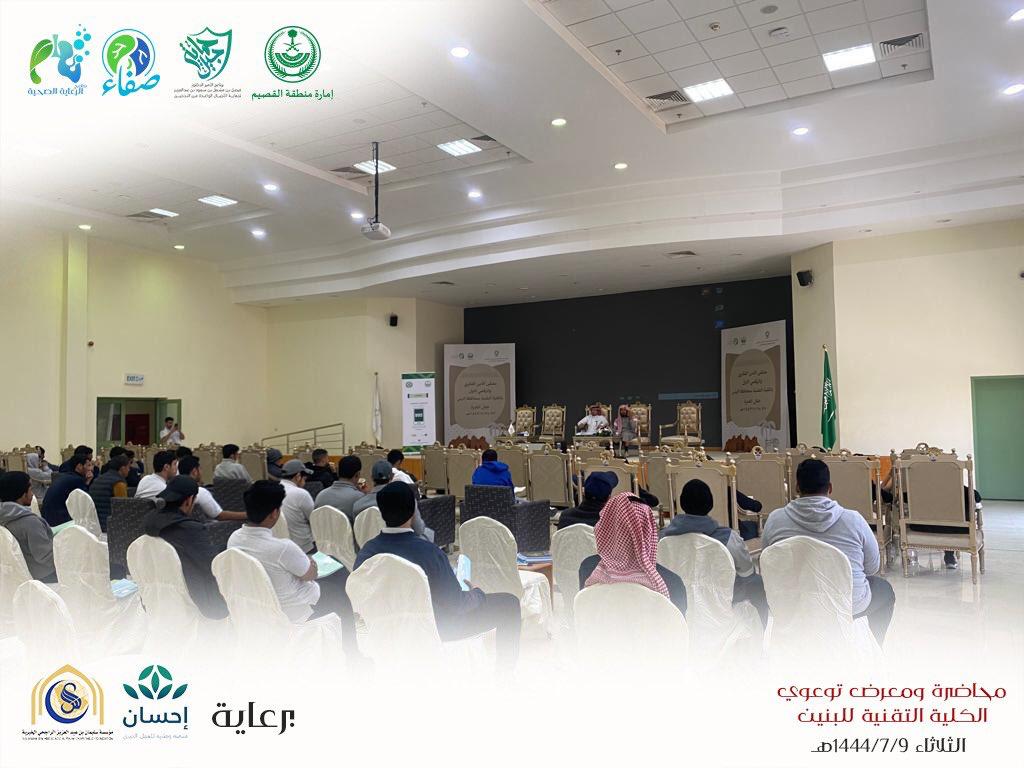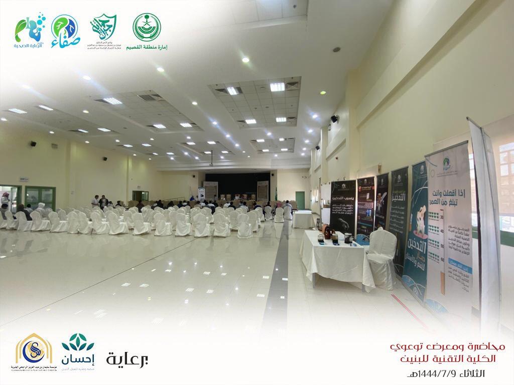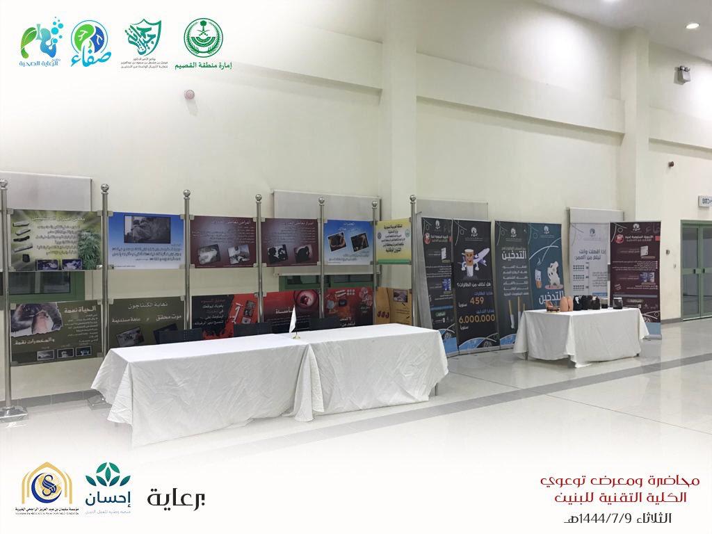 امتدادًا لأنشطة جمعية صفاء ، وتنشيطًا لبرامج الرعاية الصحية للجمعية،وتنفيذًا لبرنامج الأمير فيصل بن مشعل بن عبدالعزيز " حماية جيل " ، وبرعاية كريمة من مؤسسة الشيخ سليمان الراجحي الخيرية ، أقامت الجمعية معرضًا توعويا في الكلية التقنية للبنين يوم الثلاثاء الموافق 1444/7/9هـ