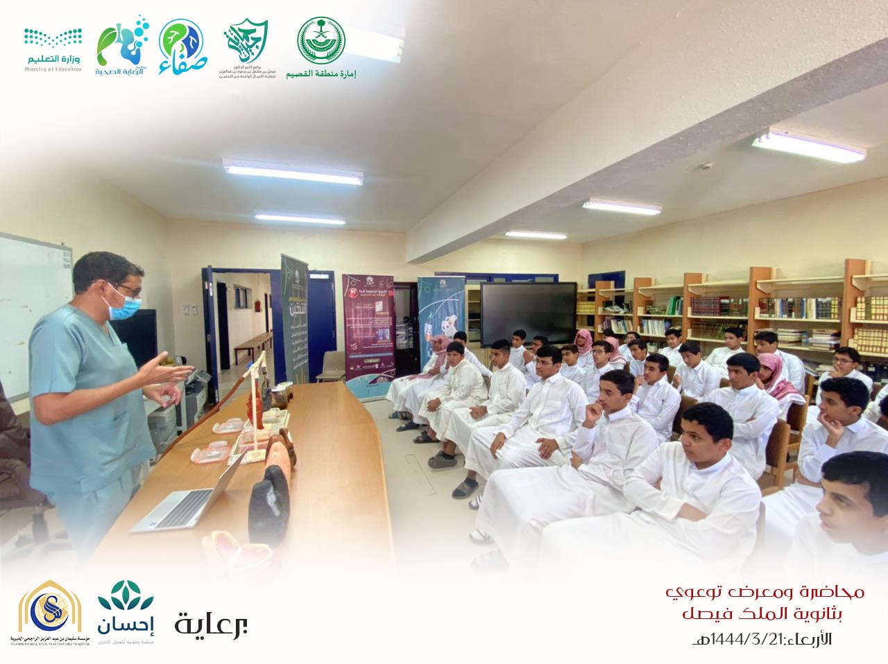 امتدادًا لأنشطة جمعية صفاء ، وتنشيطًا لبرامج الرعاية الصحية للجمعية،وتنفيذًا لبرنامج الأمير فيصل بن مشعل بن عبدالعزيز " حماية جيل " ، وبرعاية كريمة من مؤسسة الشيخ سليمان الراجحي الخيرية ، أقامت الجمعية معرضًا توعويا في ثانويةالملك فيصل يوم الأربعاء الموافق 1444/3/21هـ